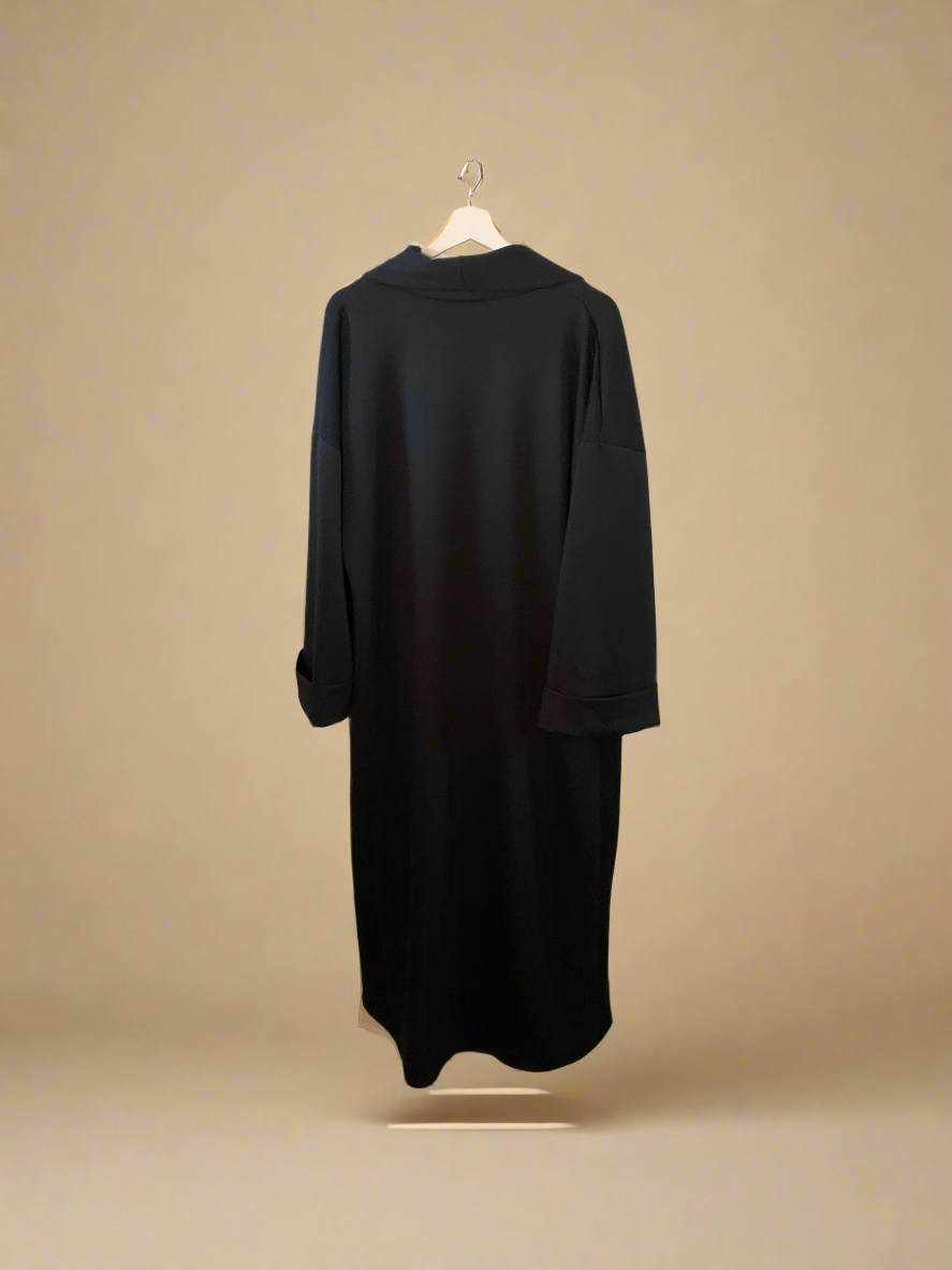 A sophisticated plush black coat with a soft, velvety finish and modest longline design. Offering warmth, comfort, and elegance, it’s perfect for layering over both casual and formal outfits on colder days.