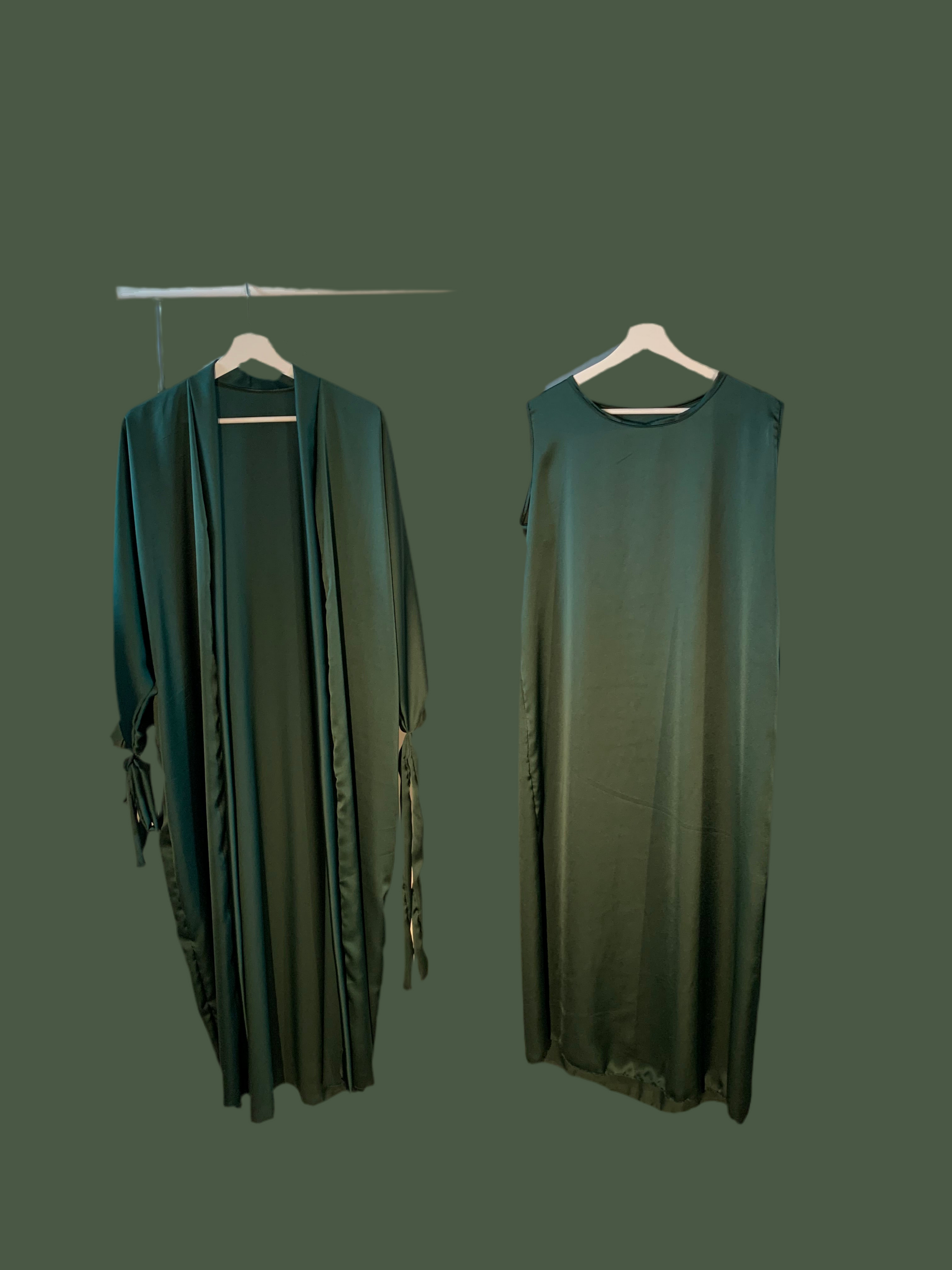 Silky Dark Green Ribboned Abaya Set