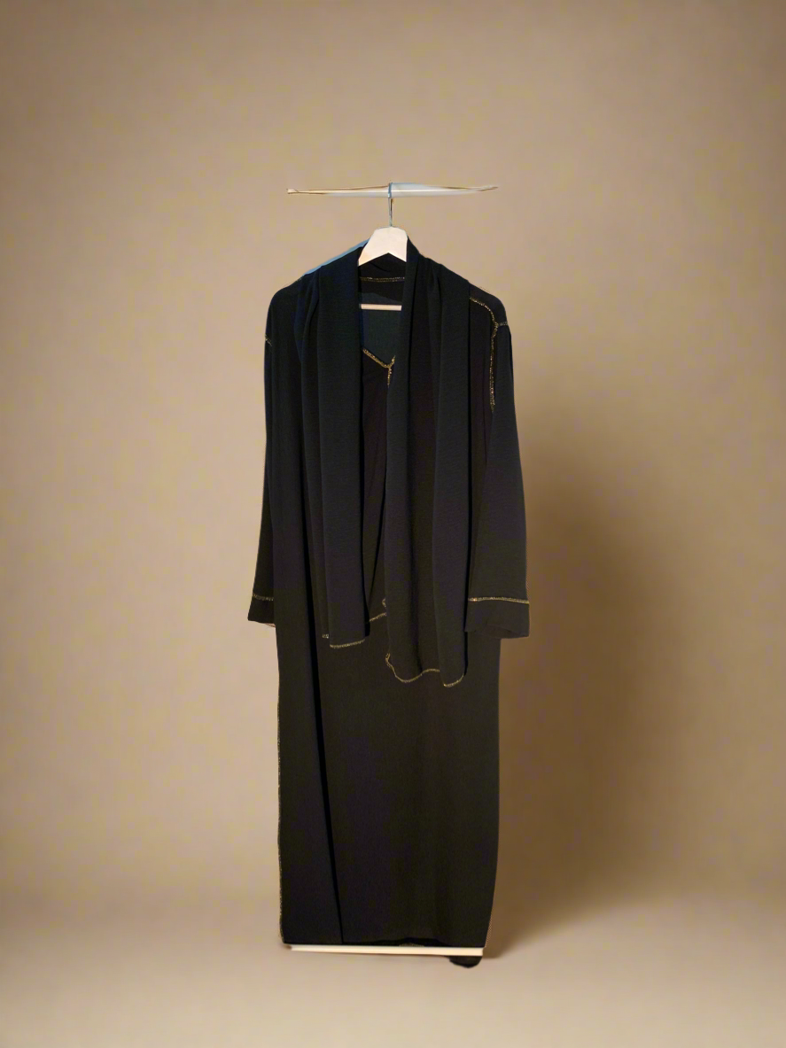 Elegant black dress with an attached poncho, finished with a shimmering golden lining that catches the light beautifully—perfect for adding a touch of glamour to any occasion.