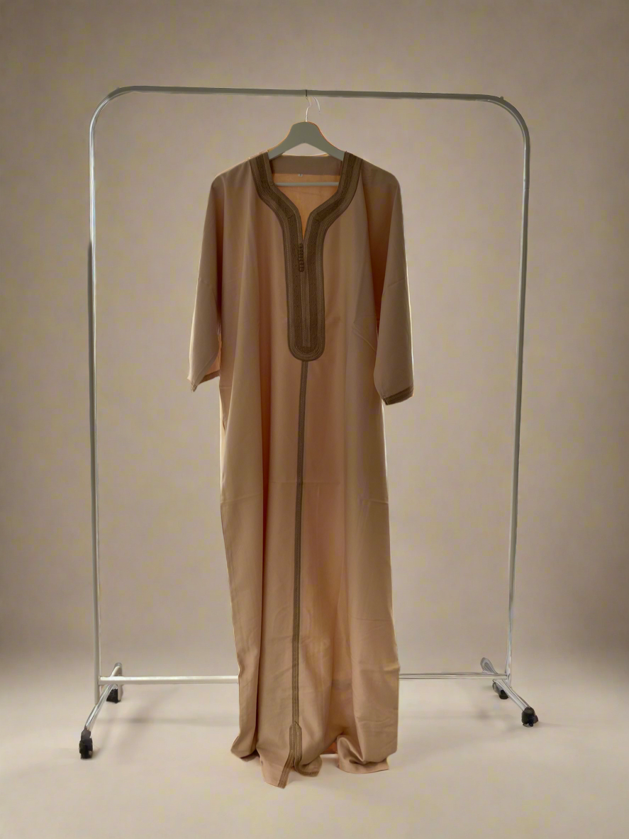 Elegant and timeless, this Moroccan thobe with a long elegant sfif and apricot features, traditional embroidery and a comfortable, flowing fit — perfect for special occasions or everyday sophistication.