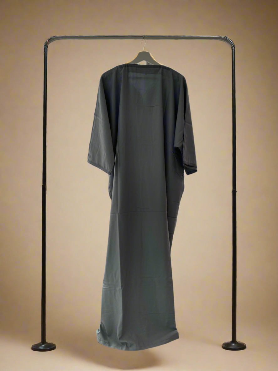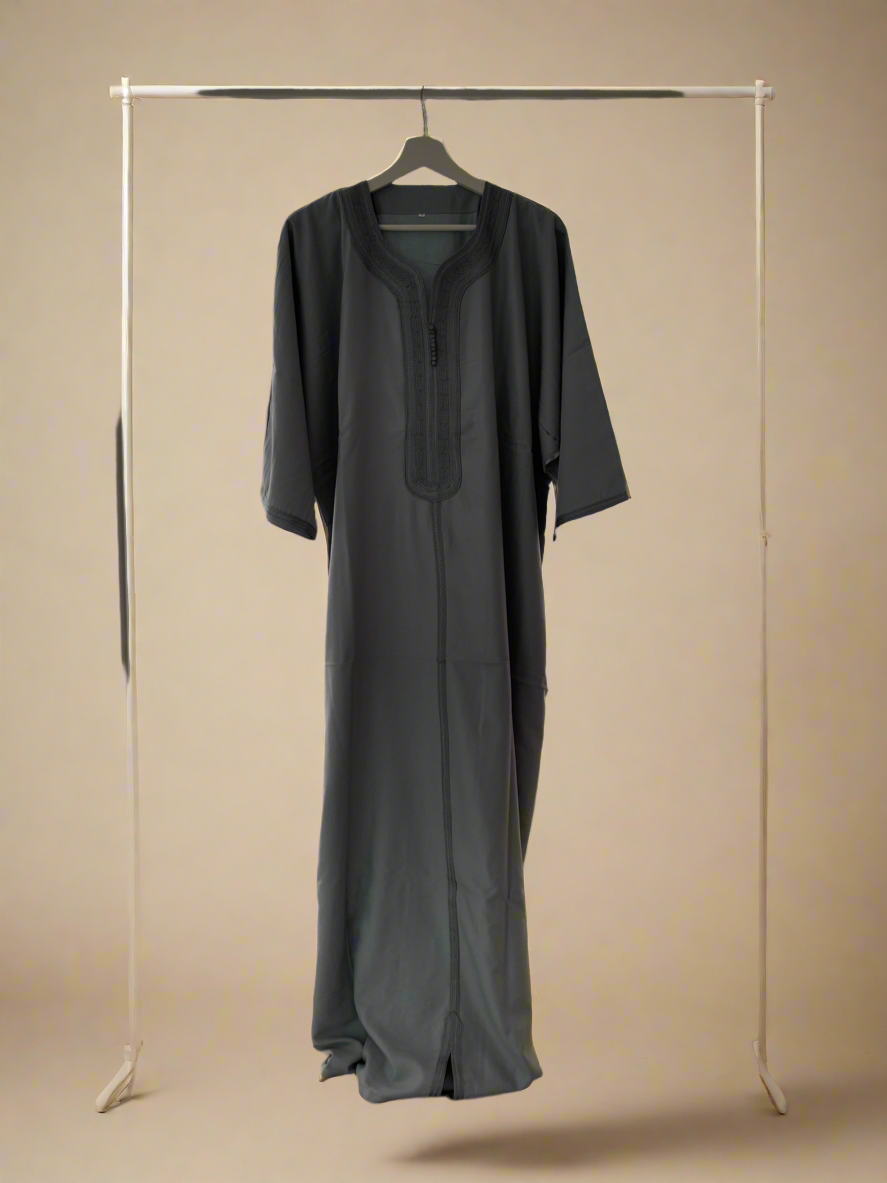 Elegant and timeless, this Moroccan thobe with a long elegant sfif and stale blue features, traditional embroidery and a comfortable, flowing fit — perfect for special occasions or everyday sophistication.