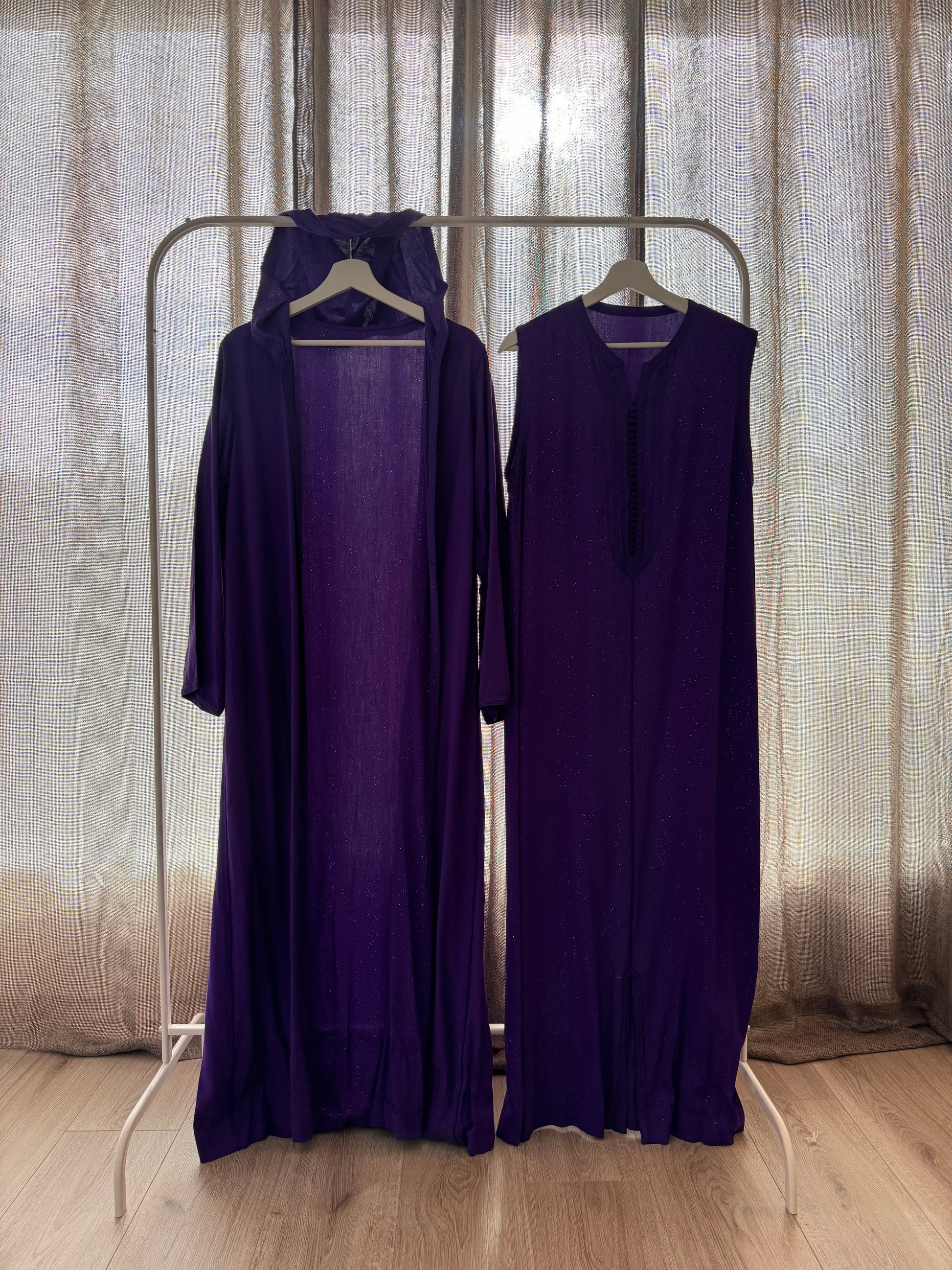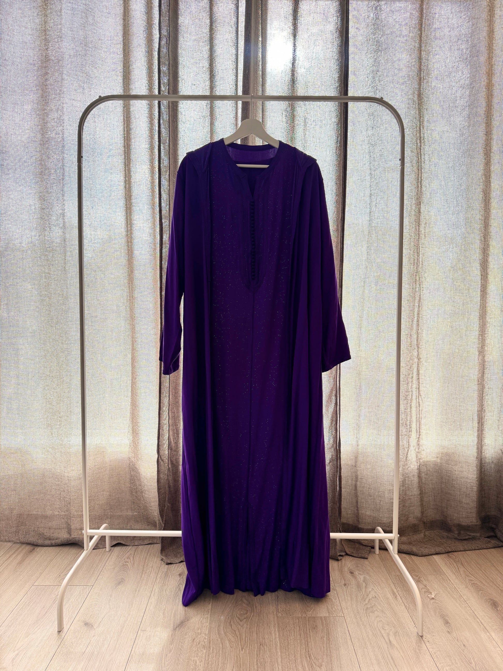 Shining in elegance, this deep purple Moroccan kaftan set is beautifully adorned with hand-applied sparkles and moroccan sfif. Crafted from soft, flowing fabric with a matching dress underneath, to match the kaftan, this luxurious piece is perfect for weddings, celebrations, or any special occasion.