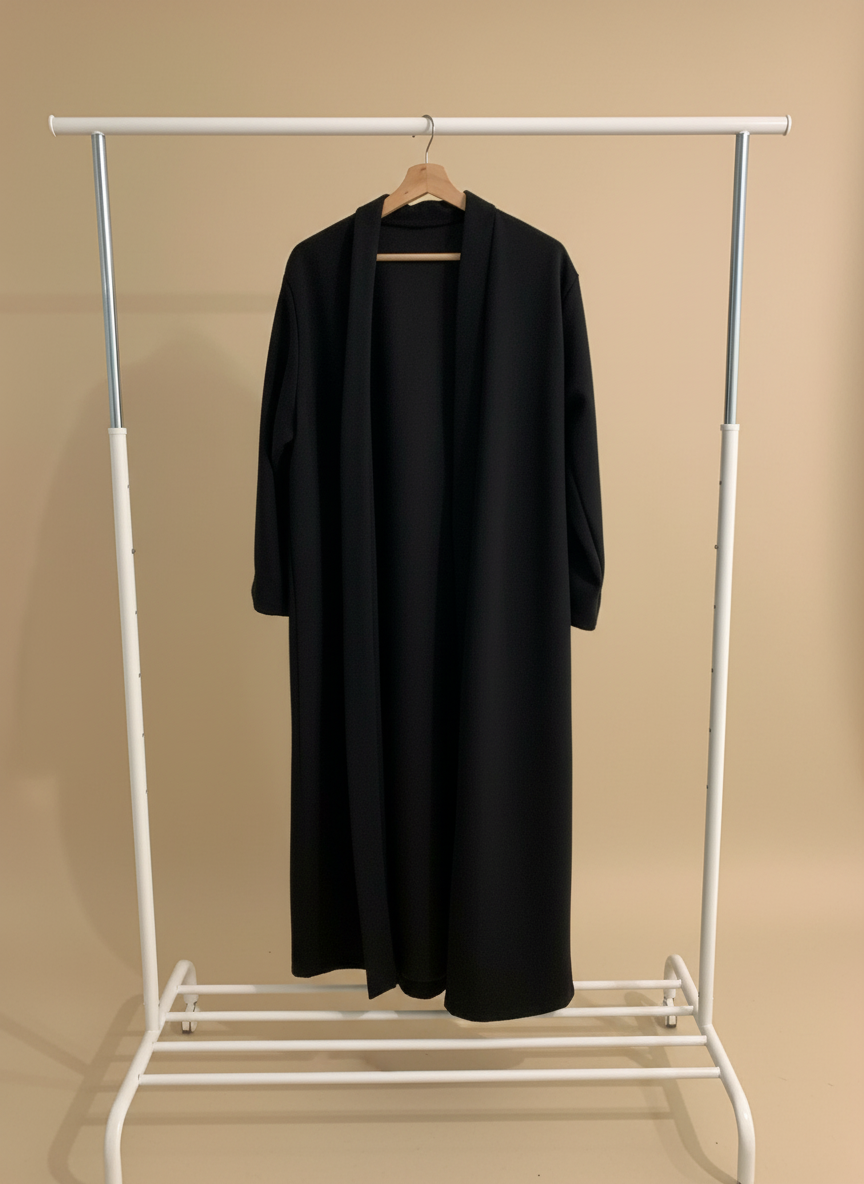 A modest black coat with a balanced fit, simple and elegant for everyday wear