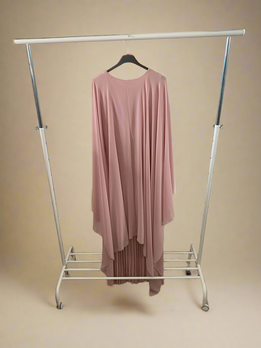 A graceful blush pink abaya featuring a layered drape over a finely pleated skirt for a flowy, feminine silhouette. Designed with modesty and sophistication in mind, it’s the perfect choice for special occasions, evening events, or celebrations, offering timeless elegance with effortless comfort.